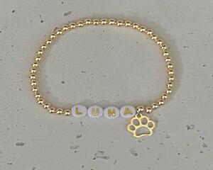 Pet Name Bracelet Paw Print Charm, 14k Gold Bead Animal Lover...